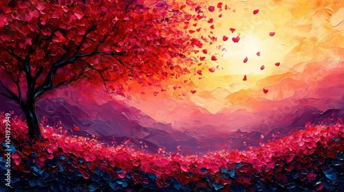 Textured close-up of an acrylic painting with expressive tree branches and vibrant red and blue spring blossoms, highlighting the intricate details of layered colors and bold strokes.