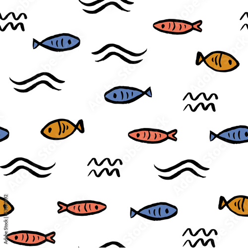 Textured hand drawn ink arctic winter seamless pattern with waves and fishes