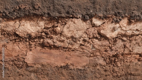 Textured layers of dry soil and clay at a construction site showcase geological stratification and earth tones under bright daylight, highlighting the natural terrain.