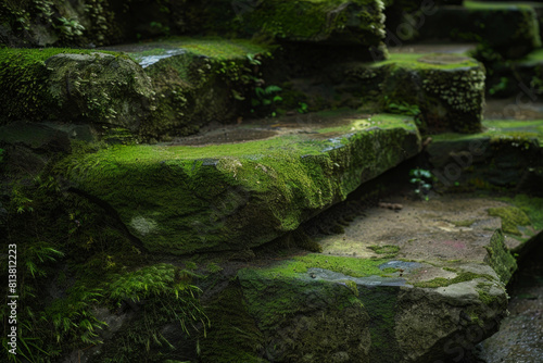 Textured patterns of moss-covered stone steps, with their earthy tones and soft textures creating a minimalist composition