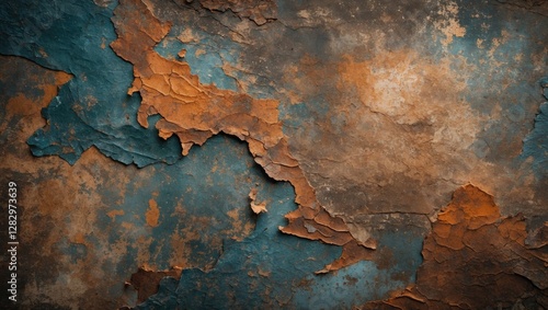 Textured peeling paint in earthy tones of orange, blue, and brown on a weathered surface close-up background