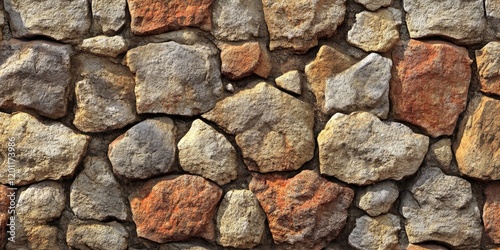 Textured stone and brick wall background in earthy tones of brown and orange with irregularly shaped stones arranged closely together.
