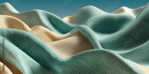 Textured teal and beige fabric waves creating a surreal 3D landscape with realistic woven detail.
