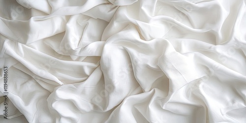 Textured white bedding sheets in soft focus with creases and wrinkles creating a seamless background; ample negative space for text and design.