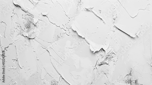 Textured white plaster wall with peeling paint and cracks for backgrounds or design elements.