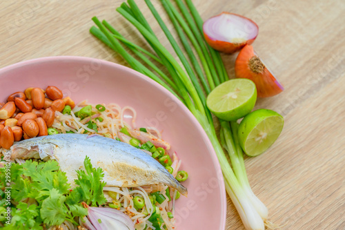 Thai cuisine delicious and spicy, Rice vermicelli spicy salad with fried Mackerel fish. Homemade or Streetfood of Thailand.