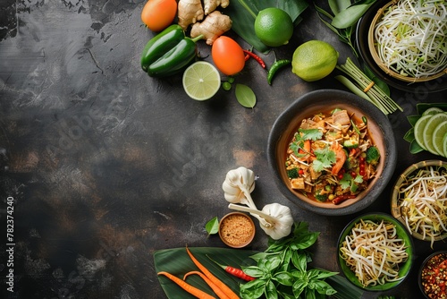 Thai dishes backgrounds with popular items like Tom yum tom kha gai pad thai noodles fried rice with pork and vegetables khao phat mu green papaya