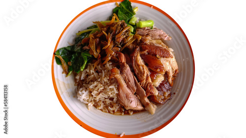 Thai food Stewed pork leg on rice on white table top view on a transparent background