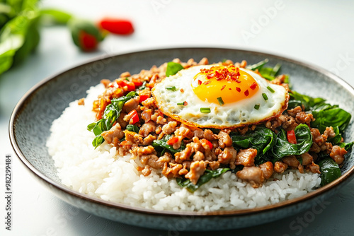 Thai food Stir fried basil with minced pork serve with jasmin rice and fried egg