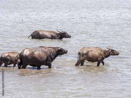 Thai local buffalos eat grass and live in the fresh green field and swamp at Phatthalung of Thailand.