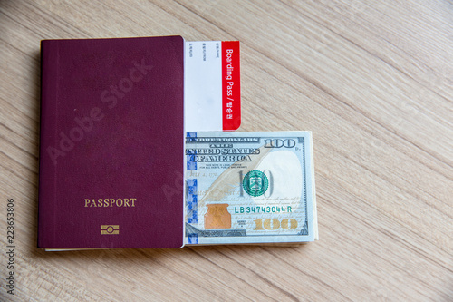Thai passport, dollars banknote, airline ticket. time to travel and freedom concept.welcome to summer vacation seasons.business trip,trust to international immigration.