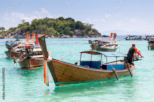 Thai traditional wooden long-tail boat and beautiful sand beach. Longtail boat on tropical island in Thailand. Tropical beach, longtail boats, Andaman Sea.