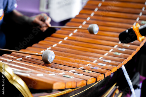 Thai Xylophone 'Ranat' in Musical Performance. An artist's hands playing a traditional Thai xylophone, called a Ranat, with fabric mallets, during a cultural musical performance.