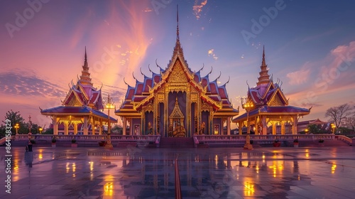 Thai-style golden temple illuminated by the soft light of the morning sunrise, showcasing intricate architectural details against a serene sky.