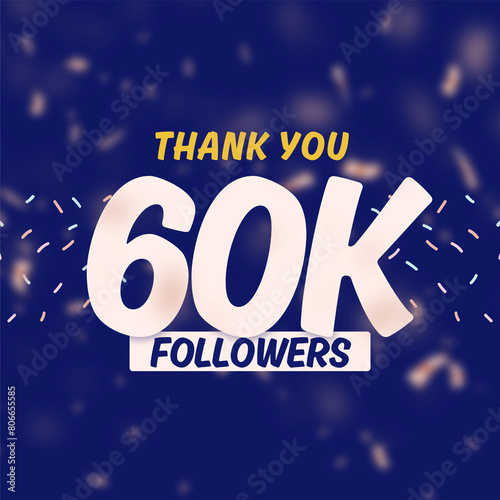 Thank you 60k followers celebration with gold rose pink blurry confetti on blue background