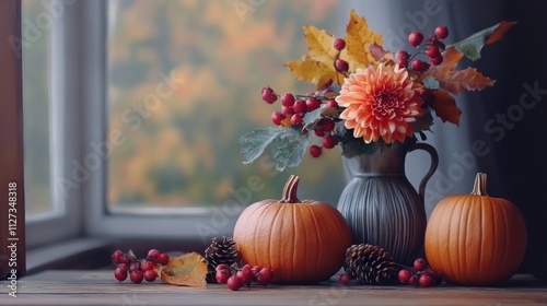 Thanksgiving autumn still life with pumpkins chrysanthemum vase fall leaves and pine cones on table seasonal decor for holiday celebration
