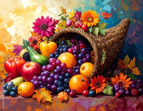 Thanksgiving Cornucopia Harvest — Autumn Fruits, Vegetables, and Flowers in Abundance