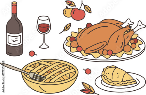 Thanksgiving Dinner Illustration with Roasted Turkey and Pies