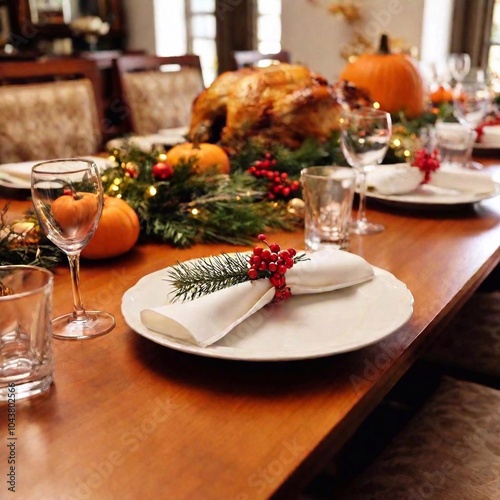 Thanksgiving dinner table setup . The deep focus reveals all the details,