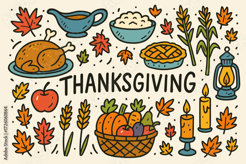 Thanksgiving flat icon set with harvest, feast, and celebration elements