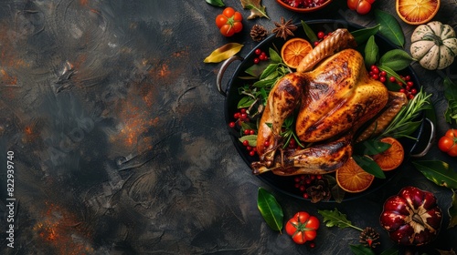 Thanksgiving Homemade Roasted Turkey. Top view flat lay background. Copy space.