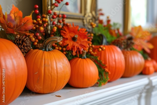 Thanksgiving pumpkin decorations placed on a mantelpiece or tabletop.