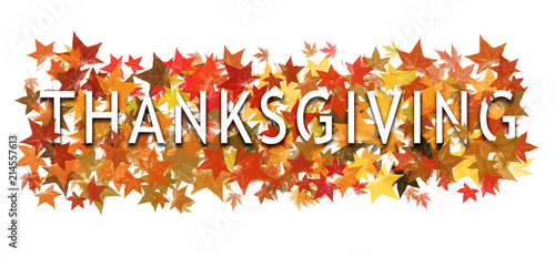 Thanksgiving text, word wrapped in and layered with autumnal leaves. Isolated on white.
