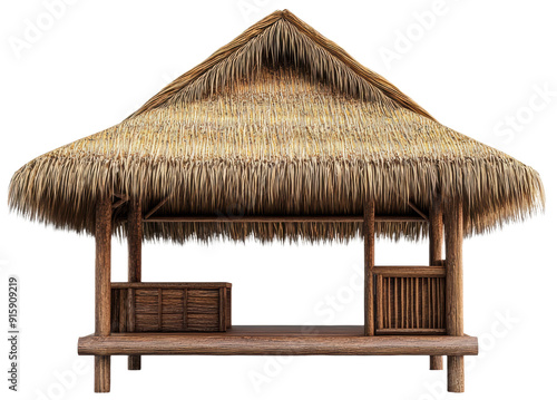 Thatched roof hut in a tropical setting, cut out - stock png.