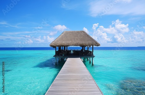 Thatched-Roof Pier with Wooden Floor Leading to Overwater Bar in Maldives, Surrounded by Turquoise Water and Blue Sky