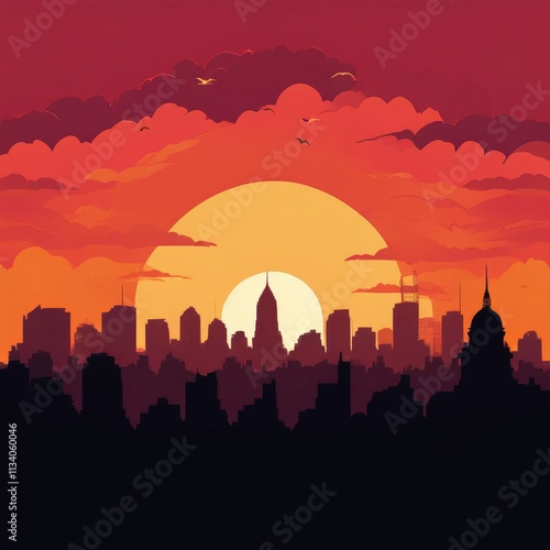 the AI Image Generator, Sunset Over City Silhouette with Birds and Dramatic Clouds