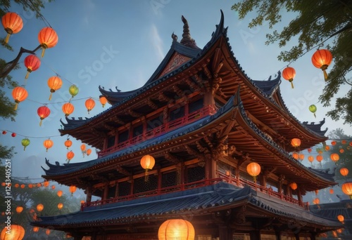 The ancient pagoda's roof is adorned with colorful lanterns and traditional decorations, temple, roof