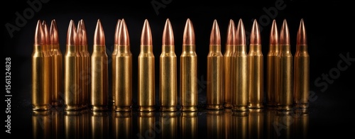 The arrangement of brass bullets on a reflective surface with a dark background.