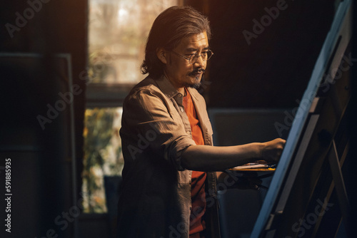 The artist paints seriously in the studio