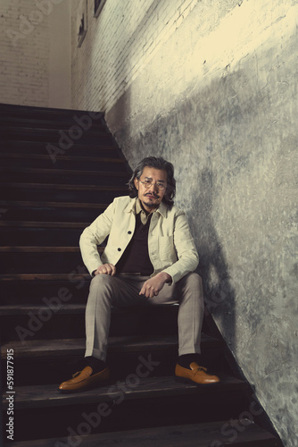 The artist sits on the stairs