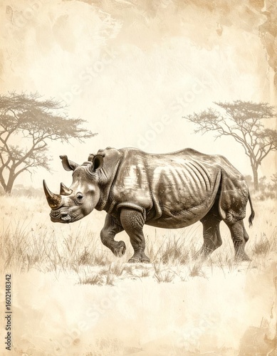 The artwork features a rhinoceros that is standing gracefully in the grass