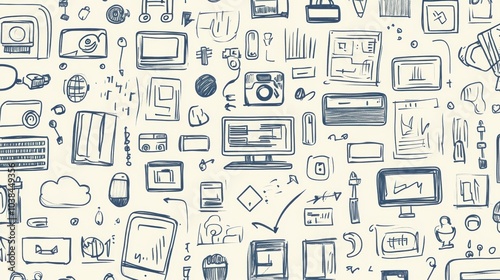 The artwork showcases intricate hand-drawn doodles of technology items, including computers, smartphones, and cloud storage icons. Generative AI
