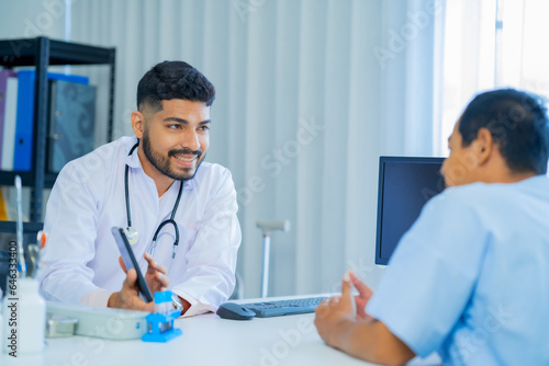 The Asian Muslim man doctor was sitting at the patient's examination table and was examining and talking about the patient with a smiling and worried face in hospital.