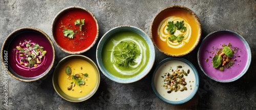 The assortment of vibrant and colorful gourmet soups in elegant bowls.