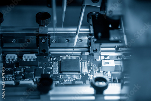 The automatic system assembly line for electronics circuit board. The hi-technology manufacturing process by automatic soldering robotic system.