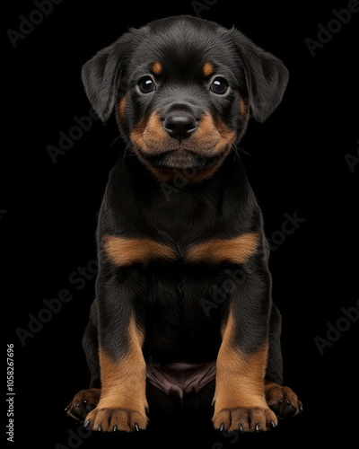 the baby Rottweiler front view, white copy space on right, Isolated on black Background
