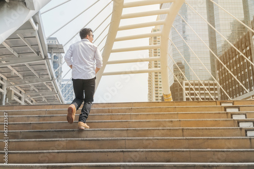 The back of a young man walking up the stairs in the city.
