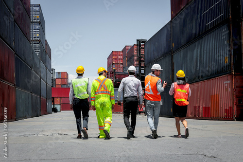 The back of effectively managing staff worker team walking together at logistic shipping cargo containers yard