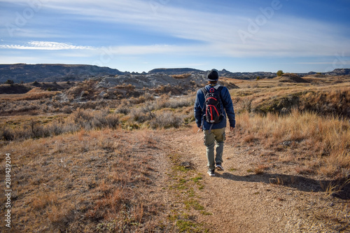 The back side of a man hiking a dirt path wearing a blue hoodie and a red and black backpack with khaki cargo pants and a hat on a sunny cold day in the rolling hills and canyons ahead and around.