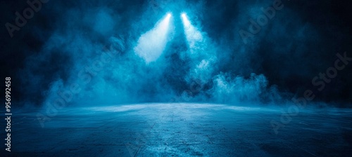 The background for display products wall is an empty dark blue abstract cement wall and studio room with smoke floating up the interior texture