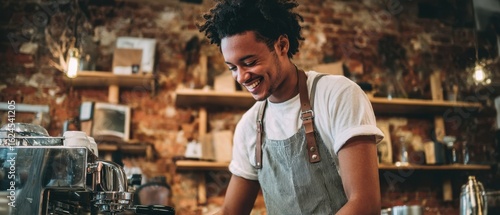 The barista expertly crafts coffee with a joyful smile in a cozy café setting.