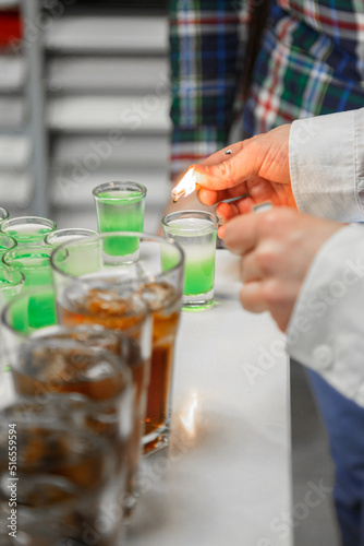 The bartender at the banquet makes cocktails. At the banquet, the bartender pours alcohol. a lot of glasses.
