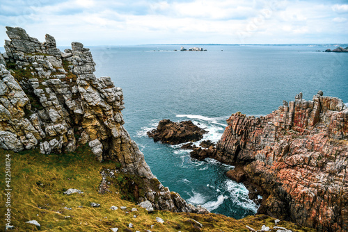 .The beautiful and rocky coast of France, the bays between the rocks, the turquoise color of the oceans. Ocean landscape.