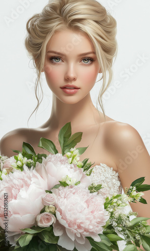 The beautiful bride is wearing a pure white wedding dress and holding flowers in her hands