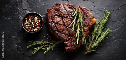 The beautifully grilled steak garnished with fresh rosemary and spices.