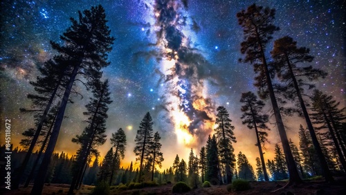 The Beauty Of Nature Is Awe-Inspiring. The Starry Sky And The Silhouette Of The Trees Create A Magical Atmosphere.